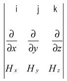 Determinants may make a solution easier to obtain, but the solution obtained is still unwieldy. Here, mathematicians have come to the rescue. The have defined a vector operator known as the “del” which is equal to (∂/∂x)i + (∂/∂y)j + (∂/∂z)k and is drawn as an upside down triangle ᐁ. Using it, we can state an equivalent to the fourth of Maxwell’s Equations by writing simply: