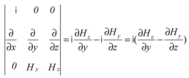 Then we note that there is no current and no change in the electric field in the y or z directions. We also note that there is no magnetic field component in the x direction. Replacing these elements in our determinant with zeros yields the following: