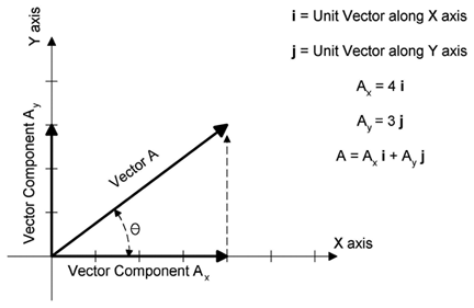The vector shown in Figure 1 has a magnitude of 5 and is angled away from the x axis by 30 degrees. It can also be described as the sum of two unit denominated vectors one 3j units long and the other 4i units long.