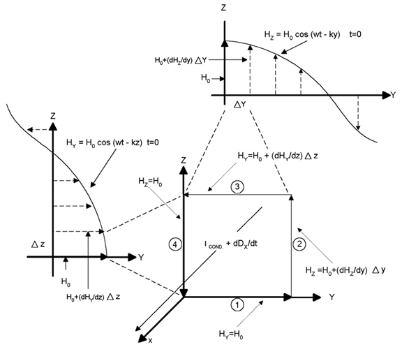 The first component, Hy = H0cos(ωt-kz) is a wave traveling in the z direction consisting of magnetic field vectors oriented in the y direction. The second component, Hz = H0cos(ωt-ky) is a wave consisting of field vectors oriented in the z direction and traveling in the y direction.