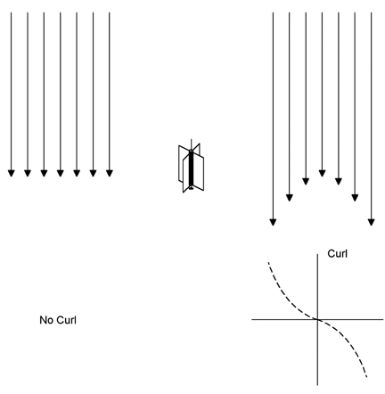 Another mechanical analog is also useful. Figure 7 shows two air streams. The air stream at the left has a velocity uniform across its breadth. The one at the right has a velocity which peaks at the sides of the stream. We can use a paddlewheel as a tool to measure the curl. The air stream at the left exhibits no curl. Insert the paddlewheel into that air stream and it doesn’t turn. Insert the paddlewheel into the air stream at the right and it will turn, except in the dead center. To either the left or right of dead center, the stream exhibits curl which causes a change in the angular momentum of the paddlewheel.