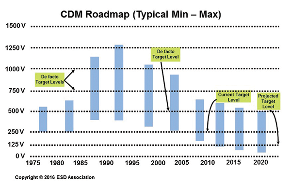 Based on the above, the projections for CDM sensitivity levels (typical min and max) are indicated in Figure 3. As shown in the figure, the CDM target has been modified to 250 volts, reduced from the previous 500 volts. But a target of 125 volts will be realistically needed in the future.