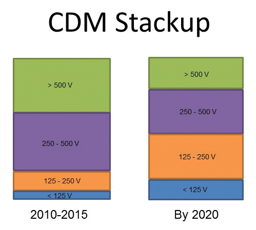 A closer observation Figure 3 might suggest that as we look ahead to 2020, there will really be no significant change in the typical range for CDM sensitivity limits. While the belief is that the range may not change dramatically by 2020, the distribution of products within this range may vary with a change in the mix of companies remaining on today’s traditional technologies and those who continue to push for technology advancements through the need for higher performance devices and growth in package size/complexity through multichip packages such as 2.5D and 3D [3, 4]. Figure 4 is a first look into how this distribution of products could conceivably look by 2020. The bottom two groups for CDM distributions are of higher concern. Thus, the industry needs to be better prepared for a relatively larger population of sensitive CDM devices by the year 2020.