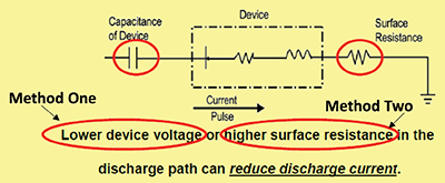 As depicted in Figure 1, two primary methods have been employed in the industry to reduce CDM and CBE damage. Both will minimize discharge currents and, thereby, ESD damage. Method One involves lowering electrostatic potentials on ESD sensitive electronics by managing static generating materials and/or neutralization of charge via ionization. This method is commonly included in industry standards, whereas, Method Two is not. However, ionization takes a finite amount of time and complete removal of charge may not be possible for a variety of reasons. This method is problematic for low CDM ESD sensitive devices and charged boards because ionization may not remove enough charge in time allocated to protect extreme senilities.