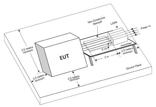 Additionally, you will notice that the minimum ground plane spacing around free-standing equipment setups has been extended to 2.5 meters from 1.5 meters. This is an important factor to be aware of when testing large equipment outside of a shielded enclosure/chamber.