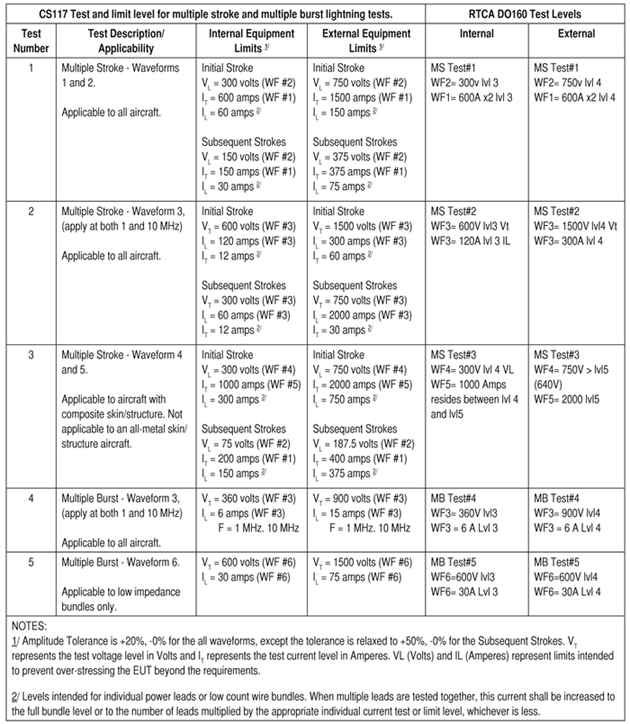 Test methodology is similar to RTCA DO160 cable bundle including Multiple Stroke (MS) waveforms 1 through 5, as well as Multiple Burst (MB) waveforms 3 at 1 MHz and 10 MHz and waveform 6. CS117 applies the Single Stroke (SS) and MS waveforms as a combined test. For this reason, the first stroke of the MS application has been adjusted to the applicable SS test level from RTCA DO-160. The MS and MB tests are not synchronized to any particular EUT critical frequency so an irregular pattern is applied and is not intended to be synchronized with the EUT timing processes. This excites the system so that the probability of upsetting periodic signals in the EUT is increased. This irregular timing approach results in excitation of the cable resonance points.