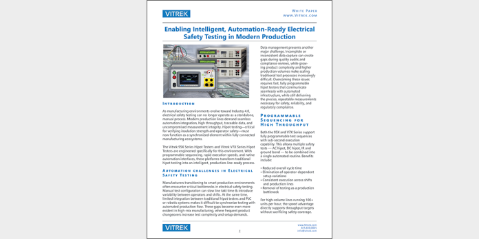 Learn how electrical safety testing must adapt to Industry 4.0 production environments with automated, high-speed hipot testing. This application note explains how programmable tests, seamless PLC/robot integration, and traceable data capture with Vitrek testers help manufacturers boost throughput, improve quality, and maintain compliance in smart, automated production lines.