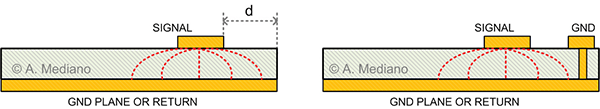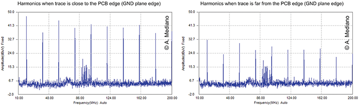 To minimize this effect we have two possibilities as shown in Figure 2. You can separate the trace from the edge and include a ground plane below the trace (left) or you can include an additional trace in top layer along the edge of the board connected to the ground planes with vias (right). In this way, the electromagnetic activity is contained inside of the PCB (the fringing effect is reduced).
