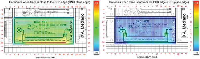Two cases will be compared: i) a top trace close to the edge of the board and without a complete ground plane below it (top figure), and ii) a top trace separated from the edge of the board and with a good ground plane below it.