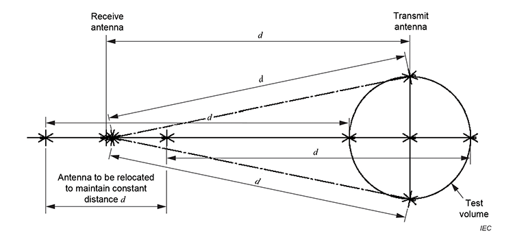 At the same time, the standard specifies that, if the EUT does not exceed a volume of 1m depth, 1.5m width, and 1.5m height, and the periphery of the test volume is greater than 1m from the closest material that may cause undesirable reflection, then transmit antennas can be placed at a reduced distance from the center (see Figures 7 and 8 on page 48 for illustrations of vertical and horizontal polarization respectively).