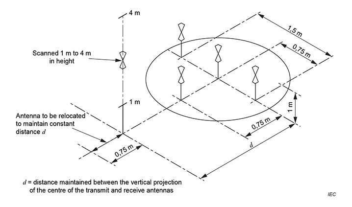 The fixed height antenna is located in the center of an unprotected OATS and the variable height antenna is located at the specified measurement distance (3m for example) from the turntable center on an antenna mast, adjustable up to a height of 4m.