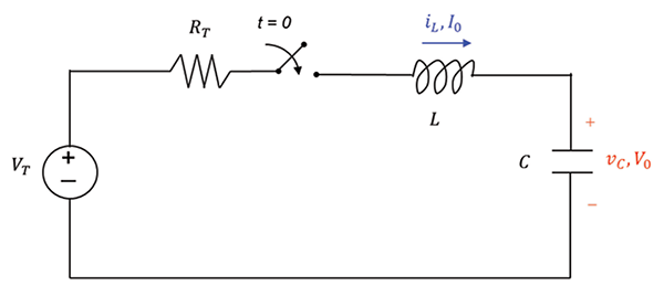 At the t = 0 switch closes and a dc voltage source, VT, is connected to a series LC configuration. In general, the capacitor has an initial voltage of V0 and the inductor has an initial current of I0.