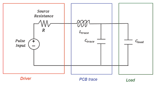 This article uses a classical circuit-theory model of a series RLC circuit to explain the phenomenon of ringing on a transmission line, or a PCB trace (see [1] for the transmission line-theory model of ringing).