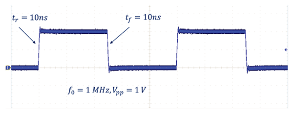 The function generator produces a 1 MHz trapezoidal 1Vpp pulse train with the adjustable rise and fall time. With the rise and fall times set to 10 ns, the voltage measured at the input to the PCB trace is shown in Figure 5.