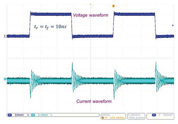 Note that the current waveform exhibits ringing in both cases, while the voltage waveform in the 10 ns case exhibits minimal or no noticeable ringing.