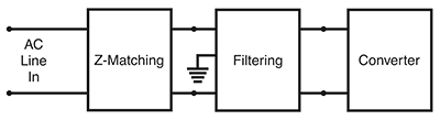 Line filters prevent excessive noise from being conducted between electronic equipment and the AC line. Generally, the emphasis is on protecting the AC line. Figure 1 shows the use of a common mode filter between the AC line (via impedance matching circuitry) and a (noisy) power converter. The direction of common mode noise (noise on both lines occurring simultaneously referred to as earth ground) is from the load and into the filter, where the noise common to both lines becomes sufficiently attenuated. The resulting common mode output of the filter onto the AC line (via impedance matching circuitry) is then negligible.