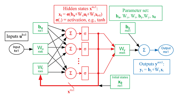 The input, u, may be either current or voltage, and the output y is the other quantity, i.e. voltage or current. Wr, Wu, Wy , bu and by are the model parameters. x denotes the internal states of the system. For example, if the system being modeled is a single diode, the variable mapping might be voltage as u, stored charge as x, and current as y. In actuality, the user does not specify a mapping from a physical quantity to the RNN model’s internal state; instead, the internal state is “learned” from data and need not correspond to an identifiable physical quantity. Figure 2 provides a pictorial view of an RNN.