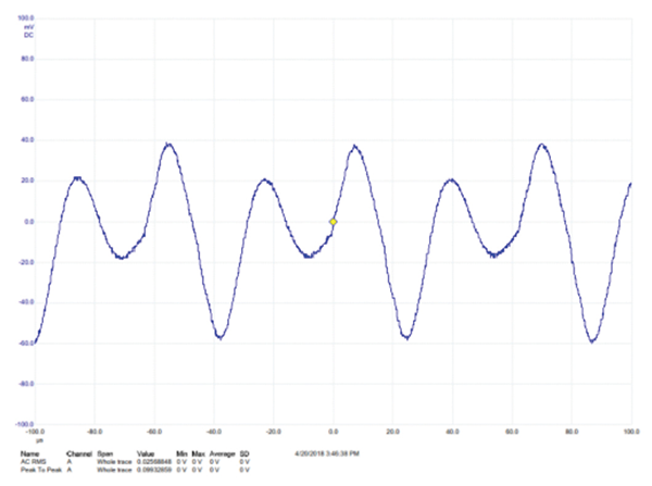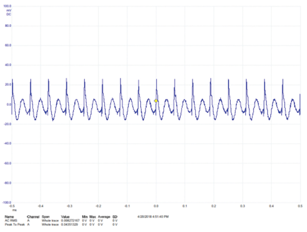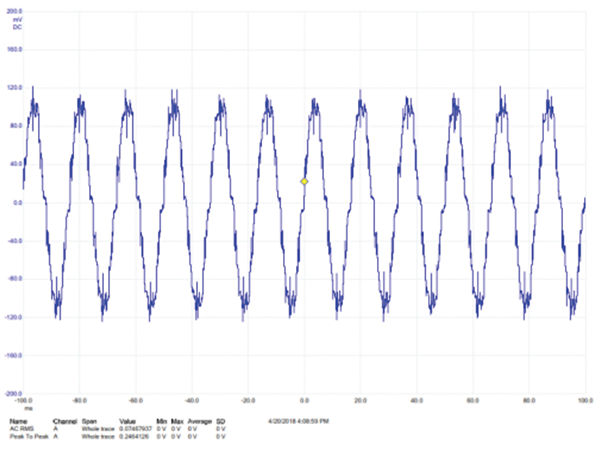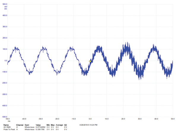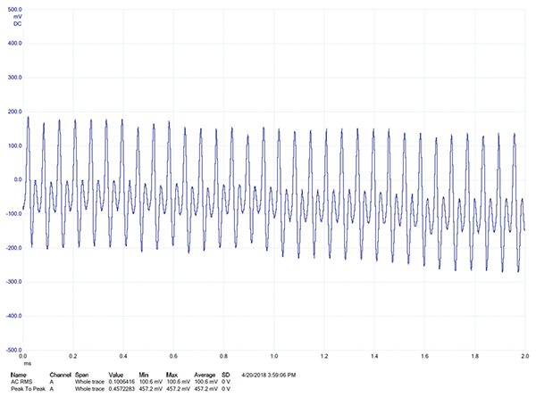 The time-domain touch current in the earth/ground lead for the NORMAL operating condition is shown in Figure 3. There is significant HF content in this waveform; the VSD switching spikes are clearly seen in this plot.