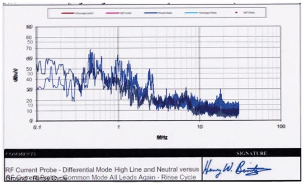 The two programmed units tested changed the VSD drive conditions as the programmed operation continued through its cycle. Figure 8, in the Appendix on page 32, captures one of those cycle changes and it is clear that there is additional high frequency noise developed during the 2nd half of the touch current plot.