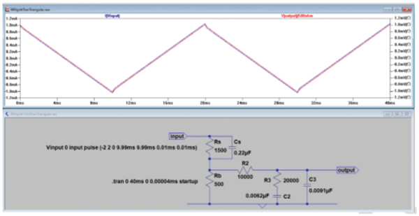 The triangular waveform in the upper part of Figure 4, the blue Input waveform, is the earth/ground complement of the Differential Mode current used by a GFCI to determine when to open the circuit. The red Output/500ohm Touch Current waveform is the Dalziel inverse filtered waveform used to determine whether or not the Touch Current is below the Dalziel letgo-immobilization limit of 7mApk (this method of measurement conveniently reduces the measurement in a way that outputs a value which allows the low frequency Dalziel value to be used for comparison).