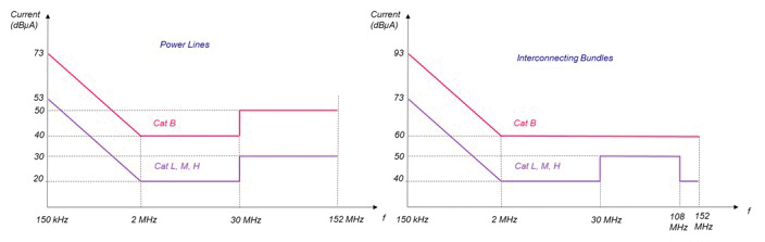 DO-160 standard specifies six different categories of devices (B, L, M, H , P, Q) depending on location and separation between the equipment and aircraft radio antennas. Conducted emissions measurements are performed in the frequency range of 150kHz – 152 MHz. Allowable limits for the power lines and interconnecting bundles, for the six categories, are shown in Figures 2 and 3.