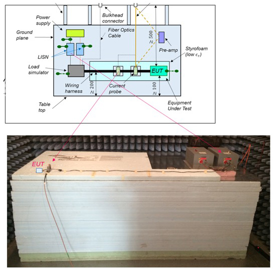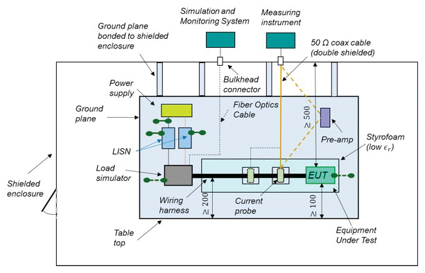 DO-160 simplified measurement setup inside the shielded enclosure for the conducted emissions measurements is shown in Figure 4.