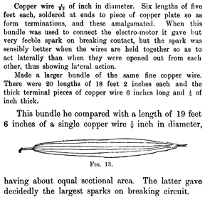 It turns out that an approximation can be made in that the resistance (and to a certain degree, self inductance — ignoring the effects of mutual inductance) of the stranded wire can be modeled as the resistance (inductance) of each strand divided by the number of strands (as each strand is effectively in parallel with the others). Interestingly, this was first empirically observed by Michael Faraday making the simple observation of “sparks” created in a circuit. When the same parallel wires were spread out, the “sparks” were less – without any change to the length of the wire bundle. Of course, we now know that fewer “sparks” mean less series inductance. Faraday’s observation is recorded as follows: