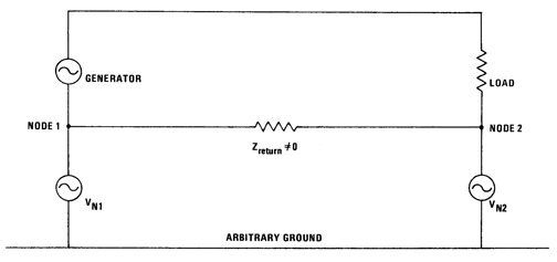 From that figure, it is easily seen that using the chassis or enclosure as an electrical return path would result in “ground” impedance being undefined and something other than the assumed zero (0) ohms. This impedance is comprised of two terms, the resistance (due to material and frequency) and inductance (due to geometry). Unfortunately, this would not be evident from looking at the schematic for the system and result equivalent circuit from this practice is shown in Figure 16.