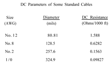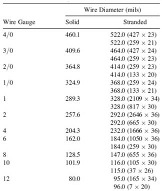 In order to provide consistency in wire selection and application, it is typically manufactured in sizes numbered according to the American Wire Gauge (AWG) tables. These tables show wire sizes from 0000 gauge (which is a 460.0 mil diameter for solid wire) to 40 gauge (3.1 mil diameter for solid wire). Of particular note is the fact that, according to these tables, a wire is a single rod or filament of drawn metal. Of course another type of wire is actually a number of solid wires bound together to function as a single wire. This more correctly is known as a stranded conductor or a cable. Table 1 shows DC parameters of typical cables of various AWG sizes. Figure 5 shows the difference between a single conductor wire and a stranded-conductor “wire”.