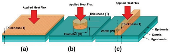 The model developed for this study was used to simulate the three geometry configurations shown in Figure 1. The first configuration is that of an infinite plate of a finite thickness which is also referred to as a large contact area. The second configuration is that of a cylindrical object contacting the skin to create a circular contact area. The third configuration is that of an infinitely long rectangular object of finite thickness and width in contact with the skin creating an elongated contact area.