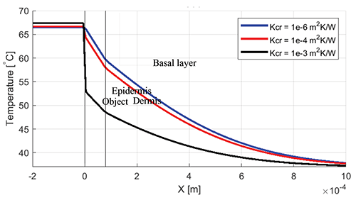 Figure 10 shows the centerline temperature profile for 5 mm thick objects with a large contact area, an initial temperature of 70°C, and contact resistances of 10-6, 10-4, and 10-3 m2K/W. At 1 sec, the 10-6 m2K/W contact resistance case reaches a basal layer temperature of 60°C, whereas the 10-3 m2K/W contact resistance case reaches a basal layer temperature of 48°C. This indicates that contact resistance plays a major role in determining the amount of heat that is transferred to the skin.