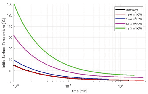 All the previous results are based on the assumption of perfect contact between the skin and the contacting objects (i.e., zero contact resistance scenarios). However, small gaps in the interface between the contacting objects due to surface roughness cause a temperature drop across the interface. This phenomenon is typically addressed by including a contact resistance between the objects. Generally, lower contact pressure and higher surface roughness result in higher contact resistance. In the context of contact skin burns, contact resistance values as high as 10-3 m2K/W are considered possible [9].
