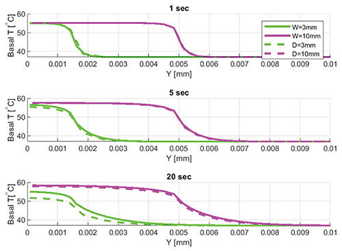 The results for the two circular contact shapes (see dashed lines in Figure 3) at 1 sec indicate a maximum basal centerline temperature of approximately 55°C. The basal temperature immediately outside of the contact area also increases as heat diffuses radially through the skin. At 5 sec, the contact with the 10 mm and 3 mm diameter objects results in a centerline temperature of 57°C and 56°C, respectively. Both basal temperature profiles flatten out as heat continues to diffuse radially into the skin. As expected, these edge effects are more pronounced for the 3 mm diameter object.