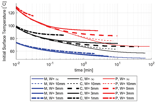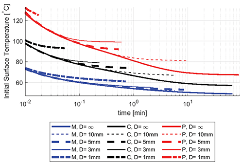 Figure 3 shows the basal temperature profiles at three different times for a circular contact area with a diameter of 3 mm and 10 mm and for an elongated contact area with a width of 3 mm and 10 mm. Both contact areas correspond to a ceramic object that is 100 mm thick with an initial temperature of 80°C.