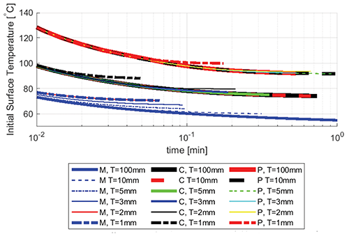 The effect of the circular and elongated contact areas was studied by holding the diameter/width constant and by varying the thickness of the object. In Figure 6, isolines of CEM43°C equal to 600 min are shown for circular contact areas with a diameter of 5 mm and thicknesses of 1 mm, 2 mm, 3 mm, 5 mm, 10 mm, and 100 mm. Similar to the trend seen in Figure 2, the curves for a particular material approach each other with decreasing contact duration. For burn thresholds found at shorter contact durations, the dominant factor is the high initial temperature of the object.
