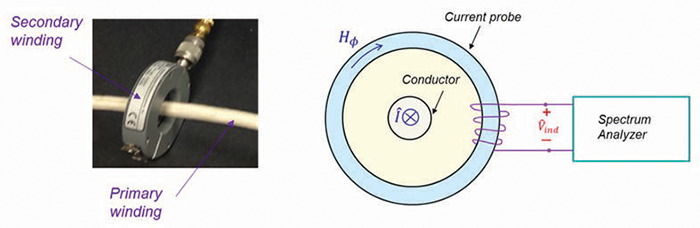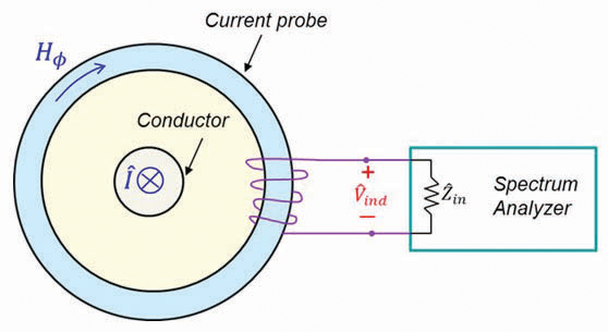 When the probe is clamped around a conductor, the conductor is the primary winding and the probe’s windings are the secondary. The current in the conductor produces a magnetic field that is concentrated in and circulates around the core of the probe. By Faraday’s law, this circulating magnetic field induces Vind that is measured by a spectrum analyzer.