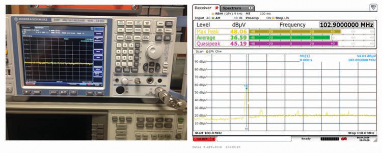 Quasi-peak detectors weigh signals according to their repetition rate, which is a way of measuring their “annoyance factor”. High amplitude low repetition rate signals could produce the same output as low amplitude high repetition rate signal. As the repetition rate increases, the quasi-peak detector produces a higher voltage output i.e., a response on spectrum analyzer or EMI receiver. Figure 12 shows an EMI receiver and its typical screen output; note the three detection modes displayed.