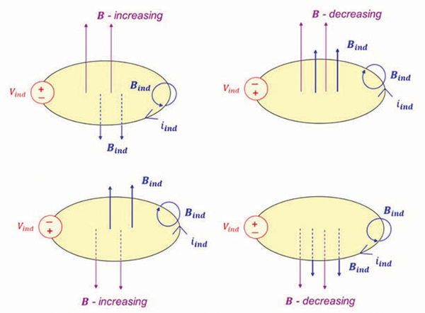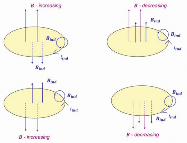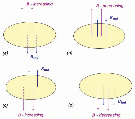 The original magnetic field B gives rise to the induced magnetic field Bind. According to Lentz’s law the induced magnetic field Bind opposes the change in the original magnetic field B.