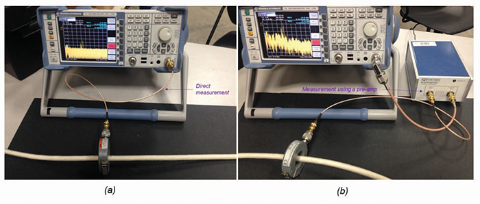 The electric current can be measured by connecting the current probe directly to the spectrum analyzer, as shown in Figure 8a, or by using a preamplifier as shown in Figure 8b.