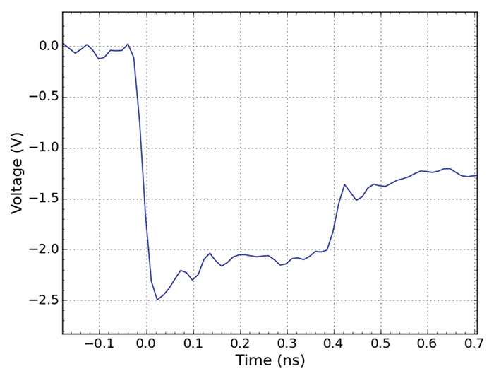 To assess the performance of the ESD protection a diode test structure on wafer was measured with the fast TLP source presented in section IV.B.2. The diode size was about twice as large as used in the ESD protection for the LNA. RF probes of type Cascade Infinity with a bandwidth of 40 GHz were used in TDT configuration. With a fast rise time of 20 ps the wiring inductance will cause a considerable inductive voltage drop. In order to eliminate this contribution, a de-embedding structure with the same metallization, but short-circuited in the lowest metal layer, was also measured. Hence, it is possible to assess the voltage contribution from the diode alone by subtracting the de-embedding waveform. In Figure 15 the voltage response of both the diode and the de-embedding structure at a current of -3 A are plotted. The voltage response after subtraction of the de-embedding waveform is presented in Figure 16.