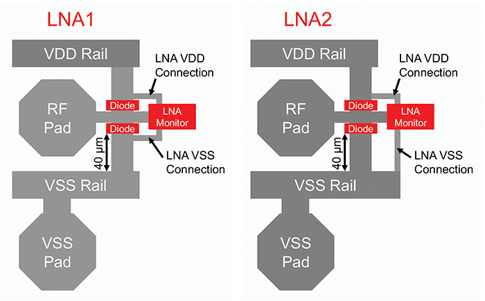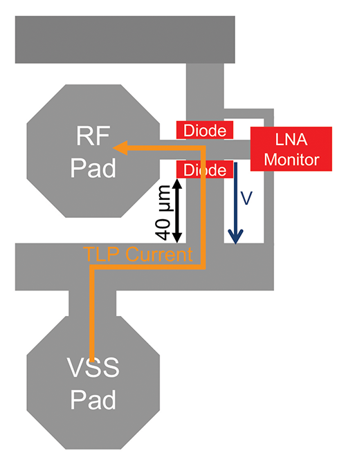 The lower failure level of -3 A for LNA2 can be explained by the additional voltage drop appearing across the vertical connection down to the VSS rail. In Figure 19 the current path from the VSS pad to the RF pad has been drawn for LNA2. It is evident that the voltage drop across the vertical VSS trace between the diode and the VSS rail will be visible at the LNA monitor. It can be estimated that the 40-µm long trace will have about 40 pH of inductance. The resistance in the path is in the order of milliohms and can be neglected.