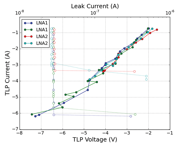 The packaged LNA interface was tested on an Orion 2 CDM tester with a JS-002 compliant test head. The results are presented in Table 1. Unexpectedly, the LNA failed at +250 V at a peak current of 2.7 A. This is only about half the current compared to the VF-TLP test results at negative polarity (corresponds to positive CDM stress). For the negative CDM stress polarity, the device failed at -400 V.
