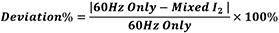 Therefore, the deviation percentage quantifies the difference between the perception of the test subject with the predicted perception level based on the frequency factor filter network. A smaller deviation implies that the frequency factor more accurately predicts 60 Hz equivalency for mixed frequencies.