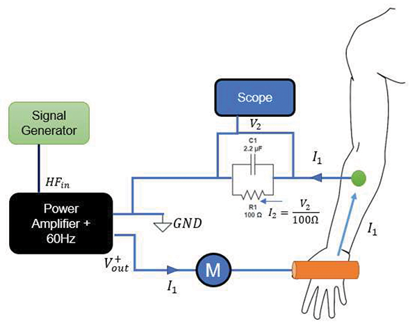 Figure 1 shows the experimental setup for the complex waveform study. The power amplifier can mix three individual frequency signals plus a 60 Hz sinusoidal (integrated within the amplifier). The power amplifier has a bandwidth of 100 kHz (−3 dB @ 100 kHz), and the output current is hardware limited to 35 mA for all frequencies for safety considerations. The maximum output voltage was also limited to 120 Vrms for safety. The current pathway was set from the lower arm to the hand (as shown) to mitigate the potential of current passing through the heart. The electrode on the arm consisted of an electronic pad manufactured by TENS for electrotherapy, as shown in Figure 1. The other electrode consisted of a copper cylinder, similar to that used by Dalziel [1] and for work previously published by the authors [9].