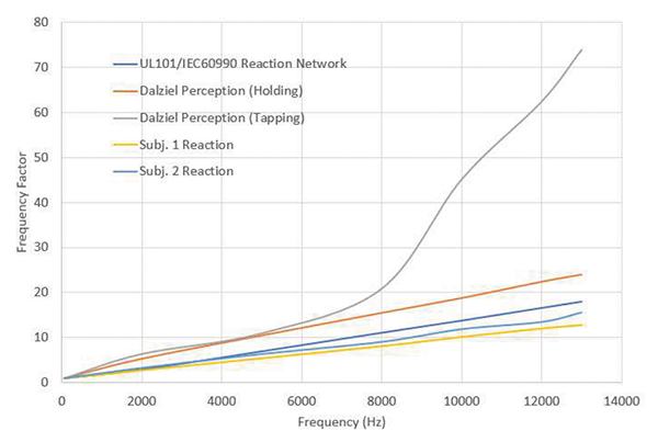 For this UL Solutions study, a signal mixer/amplifier was used for the experimental work described herein, which had the capability of mixing two higher frequency signals with or without a 60 Hz signal. Using this setup, the reaction frequency factor was measured for each of the two male volunteers and compared with the reaction network factor given in UL 101 and IEC 60990. The customized frequency factor for the particular individual was then used to calculate the equivalent 60 Hz RMS and peak current signals for the mixed frequency signals. The results of this work were then compared with the results obtained using the method by Hart in [7].