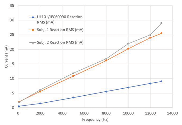 As shown in Figure 3, the personal reaction currents were quite close for the two test subjects but higher than the UL 101 threshold limits. This can be understandable since the standard limit is intended to protect 95% of the population from reaction and therefore would typically be more conservative than curves from individuals. The two subjects are both male, between 40 to 50 years old.