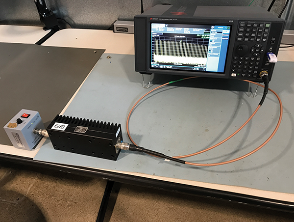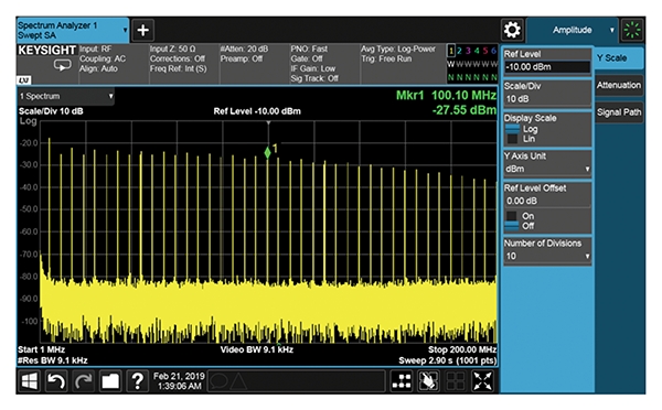 In this measurement setup we simply connected a comb generator through an attenuator to a signal analyzer and change the units from dBµV to dBm. Figure 9 shows the measurement result in dBµV while Figure 10 shows the same measurement in dBm.