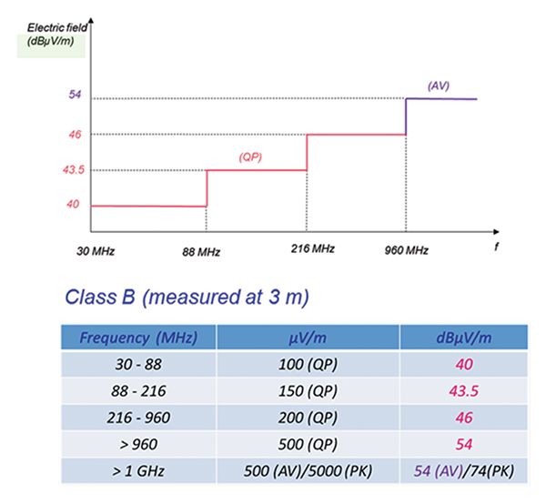 The FCC Class B radiated emissions limits are specified in dBµV/m and are shown in Figure 2 [2].
