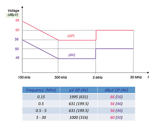 As an example of dB µA units we present the CISPR 25 limits for conducted emissions – current probe method. This is shown in Figure 6.