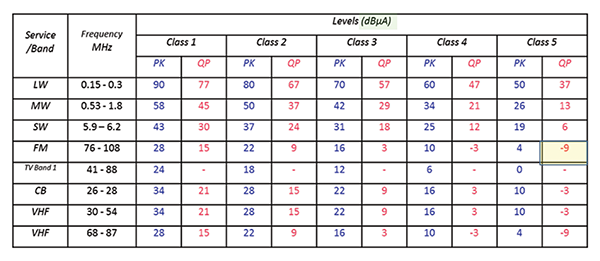 Note that for Class 5 devices the limit in the FM band (and other places in the table) is negative. How can a magnitude limit be negative? At first, this does not seem right until we look at the units of measurements: dBµA. The negative limit simply means that the measured value (which is positive) must be smaller than 1µA.